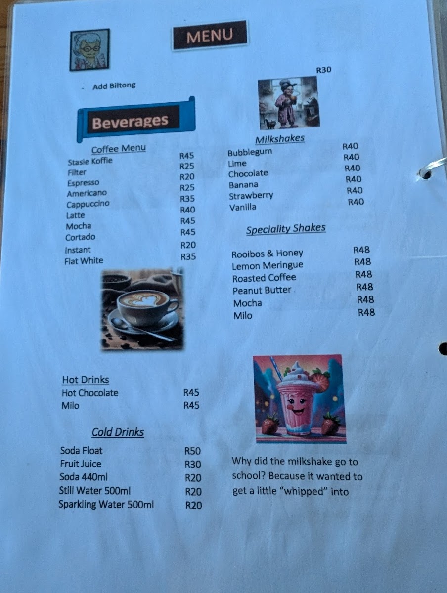 For a treat alongside your drink, you can’t go wrong with the Condensed Milk Coffee and Rusks combo, where the creamy sweetness of the coffee pairs perfectly with the crunchy, traditional South African rusks. If you're after something lighter, the Cookies are a delightful option, offering a sweet bite that complements any beverage choice. The Green Tea is a refreshing and healthy drink choice, ideal for those who prefer a more subtle taste with their meal.