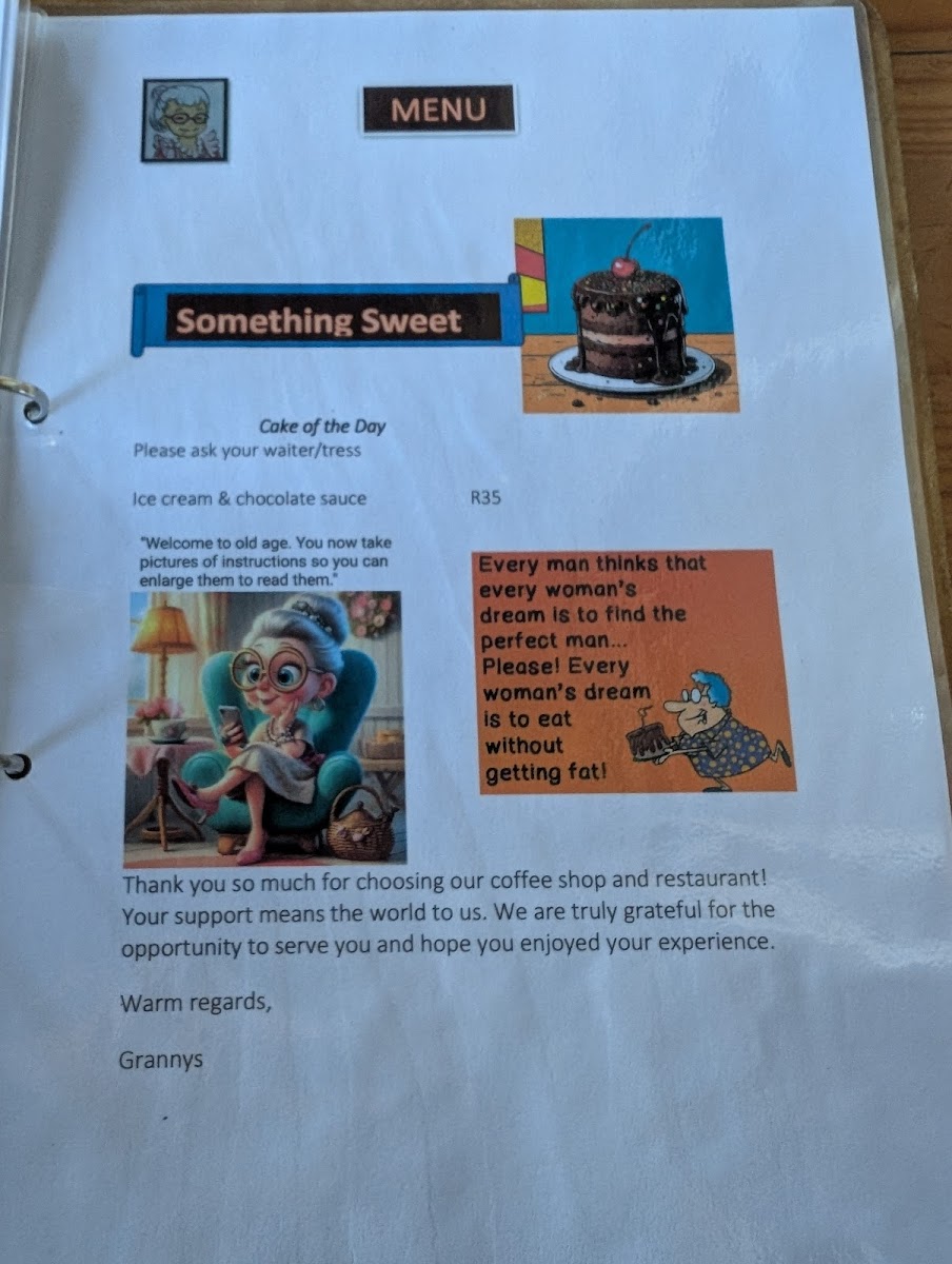 If you're craving a chilled, creamy beverage, the Blueberry Milkshake is a deliciously fruity option that adds a burst of flavor with every sip. For a truly creative experience, the Time Out Creative Arts Country Chickens offers a unique and inventive take on classic dishes. Pair any of these options with a Coffee & Ginger Biscuit, and you’ll enjoy a delightful balance of warm, spicy sweetness. Lastly, don’t forget to indulge in the Cake and Desserts, a perfect finish to your meal, featuring a variety of tempting sweet treats. Whether you’re stopping in for a quick bite or a leisurely meal, Granny’s menu has something for every palate.